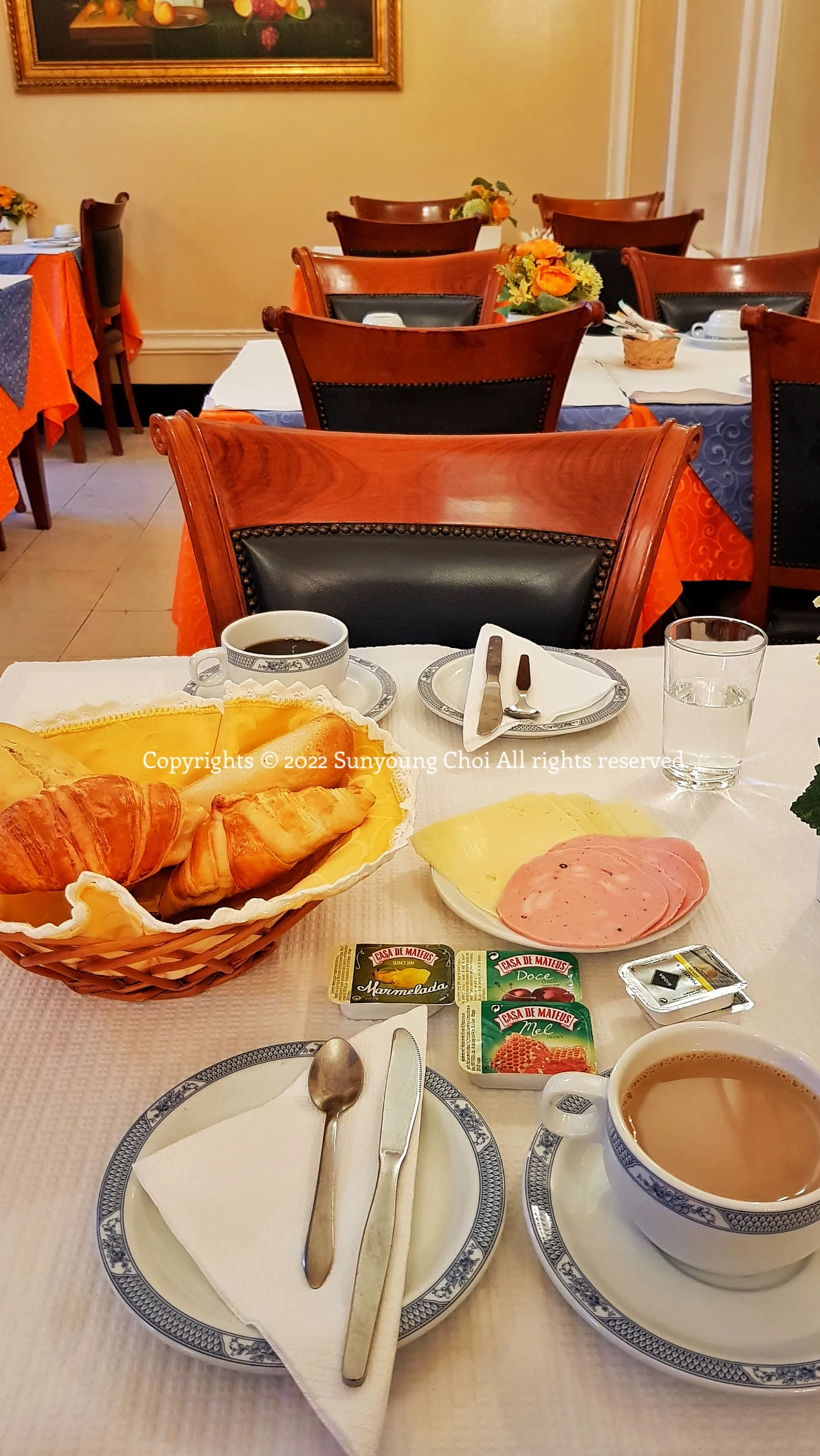 ‘이상할 정도로 바삭하고 맛있으며 버터향이 가득한 크루아상과 치즈, 공짜 연어, 분명히 내가 다 먹어버릴 것이 분명한 바구니에 한가득이 담긴 마들렌, 뭔가 지역 특산품 같은 정체불명의 케이크, 꿈의 기계(에스프레소 머신!), 오색 빛깔의 진기한 과일들과 무슨 과일로 만들었는지도 모르겠지만 어쨌든 맛있는 이 주스!’ 이 모든 것이 포함된 스타터 팩을 드신다면, 당신의 유럽 여행은 절반쯤 완성된 것이다.