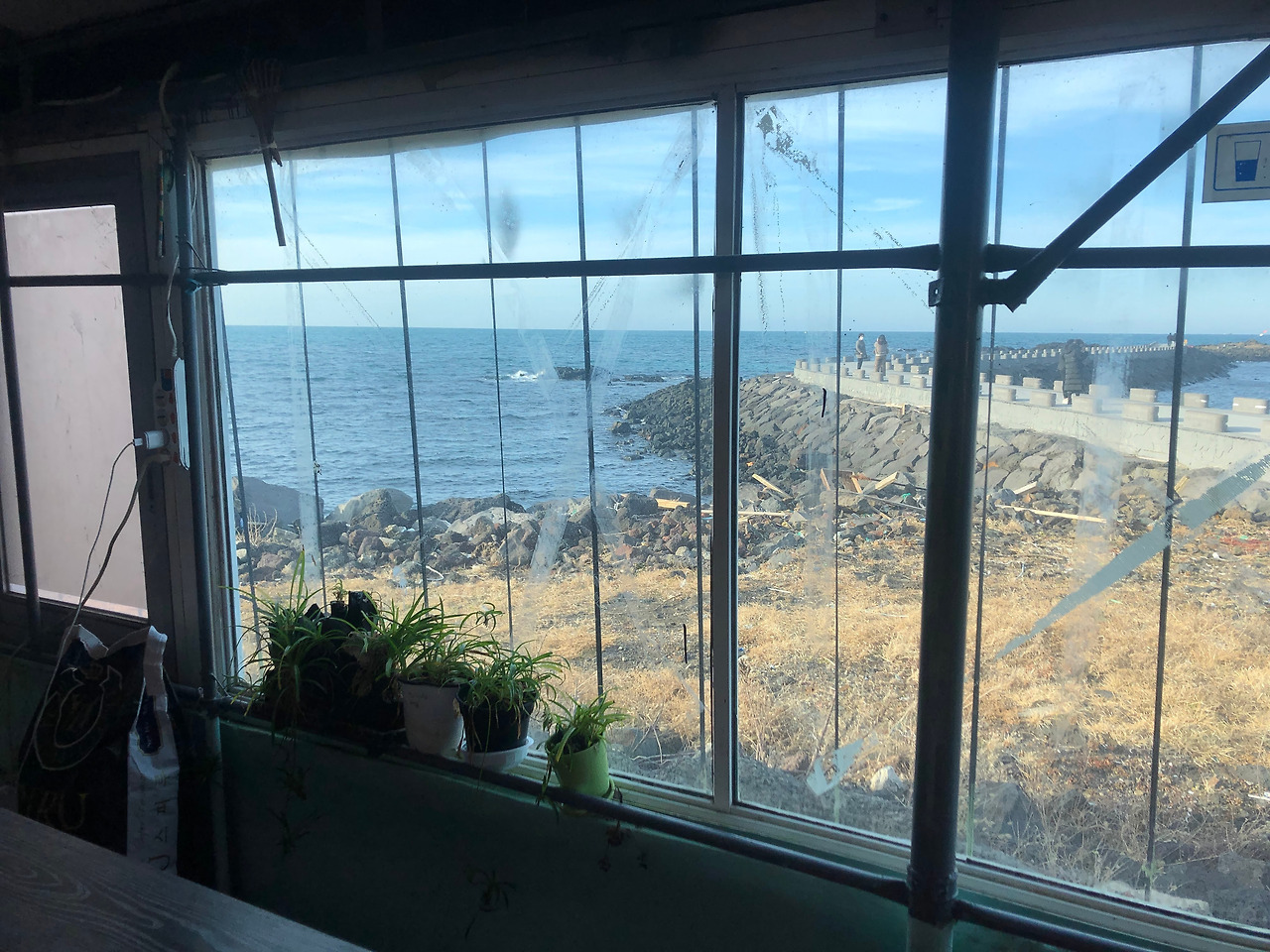 해안도로를 따라가면 나오는 좀여네 집. 포장 주문 해 둔 전복성게죽을 찾으러 갔다. 내부로 들어서니, 바다와 하늘이 인테리어를 다 했다. 뷰맛집. "10분만 기다려 주세요" 하셔서 가게 옆 바다를 향해 난 길을 걸어봤다.