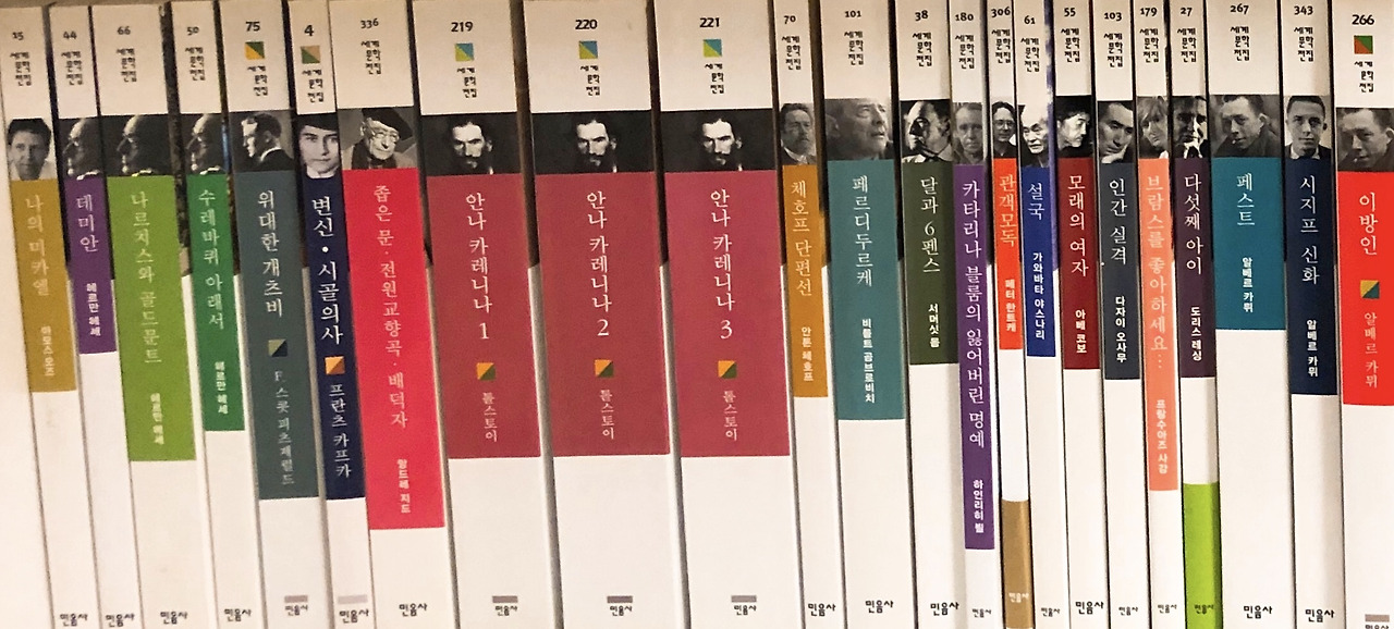 대표적인 예가 각 출판사 별 세계문학 전집이다. 나는 한 출판사의 전집을 통째로 사서 모으지는 않는다. 다만 그때그때 읽고 싶어 구매한 책이 쌓이다 보니 지금 민음사 세계문학만 책장 한 줄, 문학동네 세계문학이 책장 반 줄을 차지하고 있다. 예전에는 이유 없이 무조건 민음사로만 사들였는데 요새는 작품 하나를 들일 때마다 번역을 비교해보는 습관이 생겨 창비나 열린책들 책들도 몇 권 추가되었다. 문학동네에는 토니 모리슨이나 모니카 마론의 소설들처럼 다른 출판사에는 없는 작품들이 많아 요 몇 년 자꾸 새로 들이고 있다. 최근 출판사에서 자꾸 세계문학전집 리커버 판을 출시하고 있는데 (특히 문학동네, 을유문화사 리커버들 디자인 정말 아름답다) 나는 그놈의 세트미를 버릴 수 없어서 오리지널 버전을 고집하고 있다.