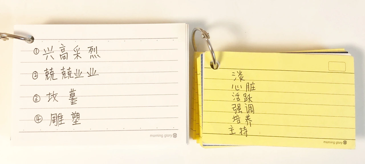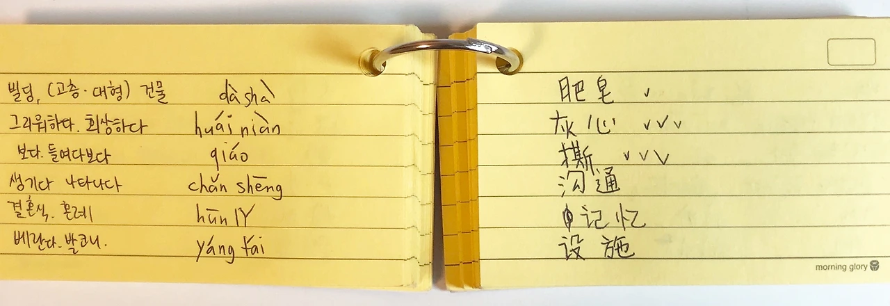 단어장에 써넣어야 할 요소는 무엇이 있을까. 영어와 스페인어와 같이 발음과 글자가 (거의) 같은 표음 문자의 경우에는 1) 단어 2) 뜻 3) 기타 설명(예문, 반대말, 유사어 등)이 들어가면 된다. 중국어의 경우 여기에 pinyin이라는 병음(소리 표기)을 추가로 표시해줘야 한다.