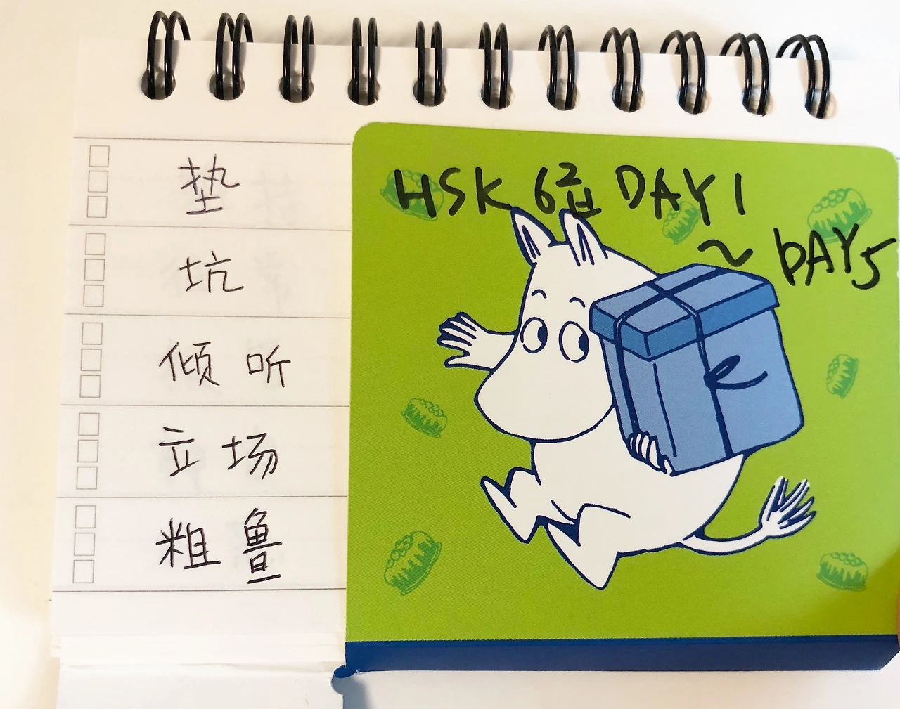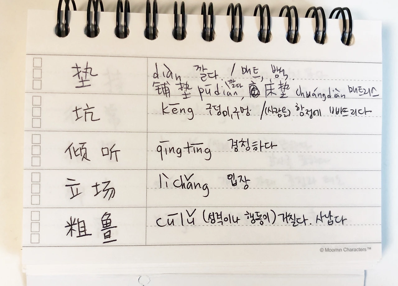 내가 좋아하는 무민 캐릭터. 그리고 딱 어학 학습 맞춤 용으로 신경 써서 제작된 구성. 특히 단어를 적는 란이 두 줄 간격으로 큼직하게 되어 있어서 중국어 단어를 쓰기에 딱 좋았다. 앞면에만 단어, 병음, 뜻을 모두 표기할 수가 있어 뒷면은 추가로 각 단어 당 예문을 두 줄이나 할애해서 쓸 수도 있다. 하드커버 표지가 단어를 가리는 용도와 뜻을 가리는 용도로 구분되어 있어서 필요에 따라 암기 학습을 하기에도 편해 보였다. 이거다! 이게 바로 내가 찾던 완벽한 단어장이라고!