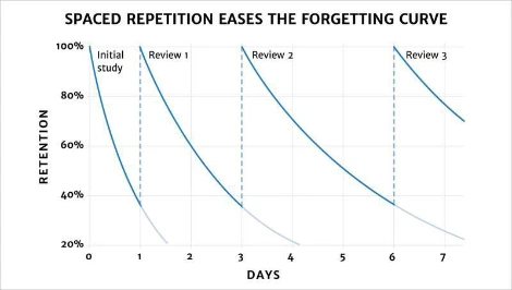 나는 구글에 spaced repetition 이미지 검색을 했다가 아래와 똑같은데 선 색깔만 다르거나 표현만 조금 다른 결과를 무수히 확인할 수 있었다. 이 이미지의 포인트는 반복 횟수를 늘려나갈 때마다 망각하는 곡선이 완만해진다는 점인데(=반복할수록 덜 까먹게 된다), 그 정도의 차이가 내 생각보다 크지 않아서 실망스럽다. 아래 표에 따르면 6일 차에 세 번째 복습을 해도 다시 7일 차가 되면 70% 수준으로 또 떨어지는 것이다... 머리가 비상하게 좋은 게 아니라면 네 번이든 다섯 번이든 계속 반복 학습을 해야만 겨우 배운 걸 잊지 않을 수 있다.