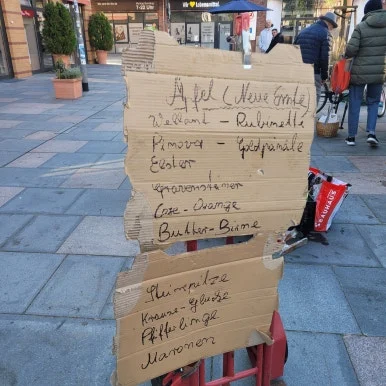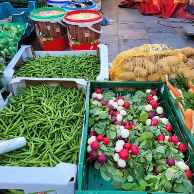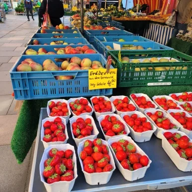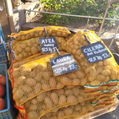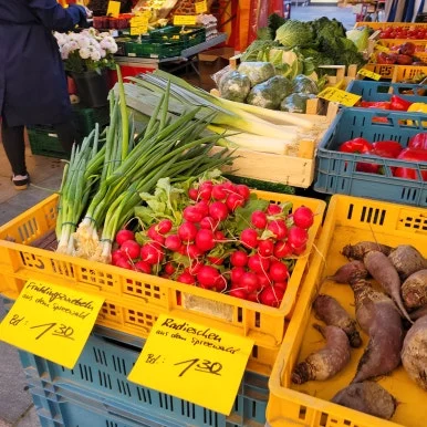 형형색색의 다양한 채소와 과일들, 그리고 유럽을 대표하는 식재료인 감자는 대용량으로 포장되어 있었다. 사실 가격은 마트에서 파는 것들에 비해 조금씩 더 비싸다. 로컬 장터라 농부들이 직접 재배한 재료들을 가져오기 때문에, 대량으로 유통되는 마트 상품과 비교하면 아무래도 가격이 높을 수밖에 없다. 예를 들어 파 한 단은 마트에서는 약 0.89유로 정도이지만, 사진 속 가격표에는 1.30유로라고 적혀 있다.