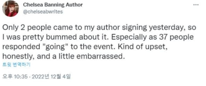 미국의 한 신예 작가가 첫 소설을 출간한 기념으로 사인회를 열었다. 작가 배닝은 설레는 마음을 안고 참석했지만 첫 사인회 결과는 처참했다. 이날 배닝에게 사인받은 독자는 달랑 2명이었다. 배닝은 전날 있었던 일을 공유하며 자신의 속상한 마음을 SNS에 올렸다. "사전조사에서는 37명이 와주신다고 했는데 2명 밖에 안왔다, 솔직히 좀 속상하고 창피하다."