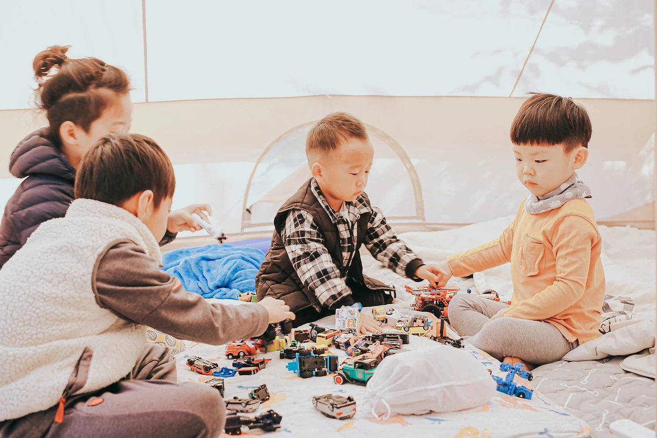 아들보다 두 살 어린 꼬마였지만 성별이 같은 남자인지라 바퀴 달린 것과 변신하는 것에 반응하긴 마찬가지였다. 필연적으로 서로의 장난감에 빠져든 아이들은 로봇과 자동차로 가득히 쌓아놓고 텐트 안에서 놀기 시작했다. 순식간에 텐트 안이 키즈카페가 되어버렸다. 애써 잘 펴놓았던 이불들이 흐트러졌지만 전혀 개의치 않았다. 너희들끼리 잘만 놀아준다면야 뭔들 상관있을까.