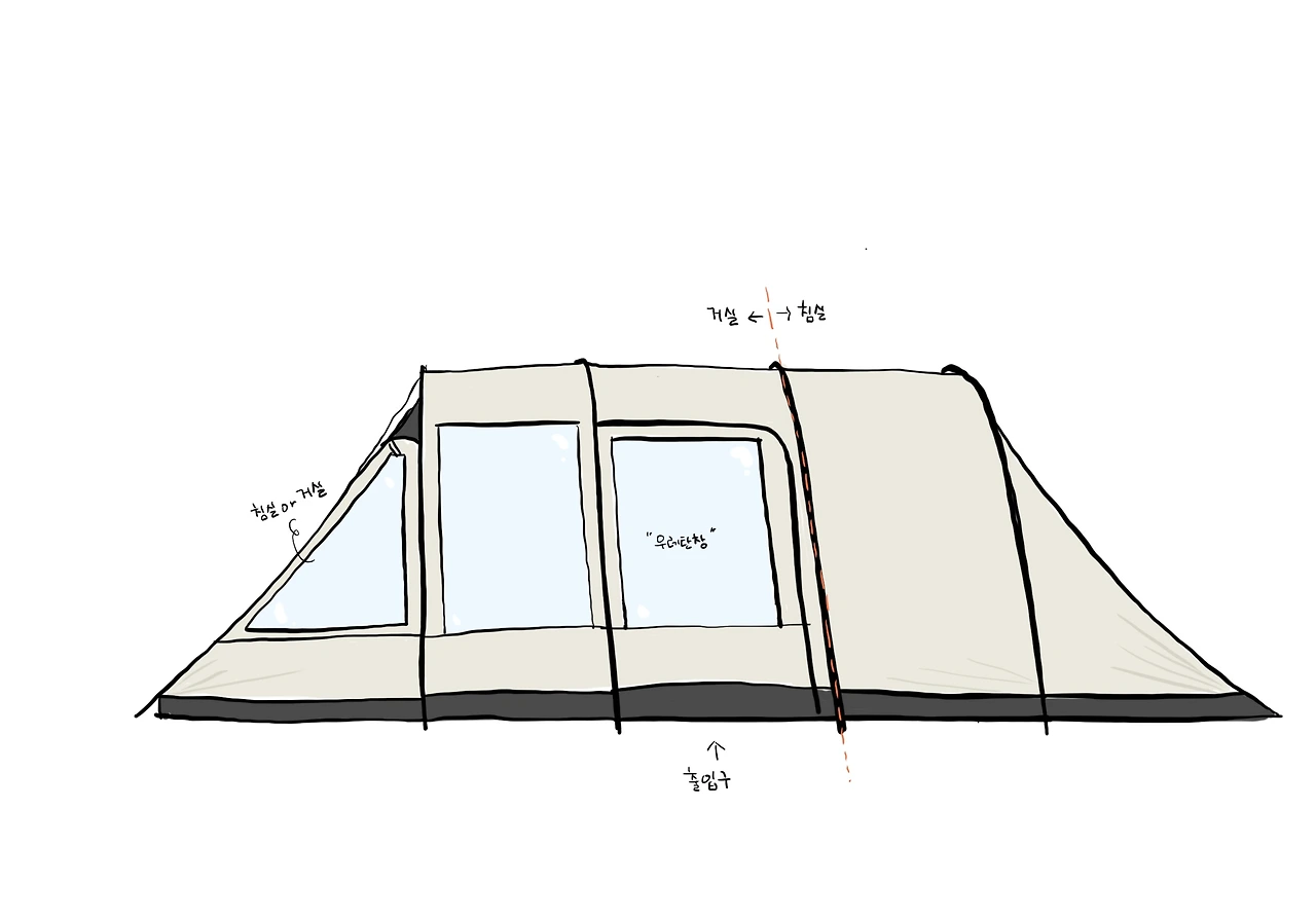 아이가 초등학생 정도가 된다면 해볼 만하겠는데 아들은 전형적인 한국 스타일이라 바닥 생활에 더 익숙했다. 잠도 워낙 굴러다니면서 자기 때문에 야전침대에서 잠을 재웠다간 굴러 떨어질 확률이 200%였다. 때문에 우리는 좌식생활이 가능한 거실이 있는 텐트를 찾기 시작했다.