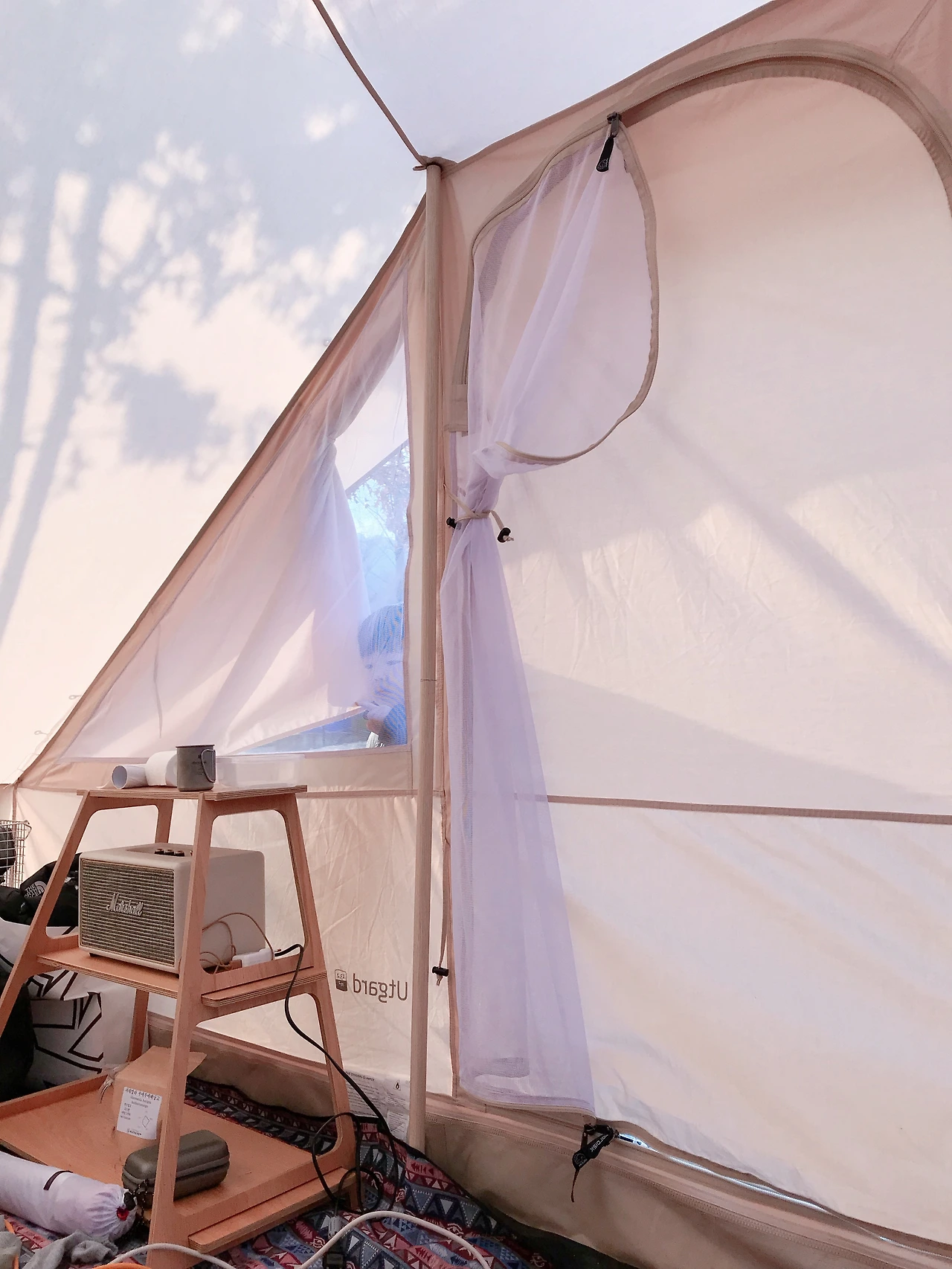 텐트의 재질이 면이라고 해서 어렴풋이 아이보릿빛일거라 생각하고 있었는데, 막상 지어보니 텐트는 연분홍빛이 감도는 아이보리색이었다. 이런 오묘한 색감을 어떻게 하면 정확하게 설명을 할 수 있을까. 가까이서 보면 아이보릿빛인데 전체적으로 보면 베이비 핑크 같기도 한 이런 느낌을.