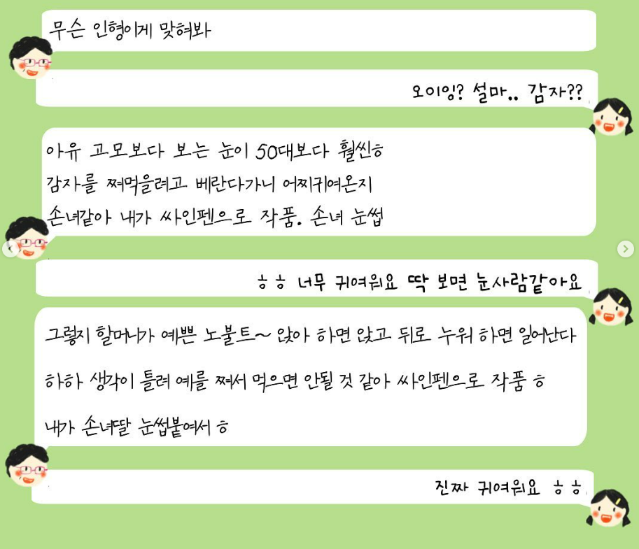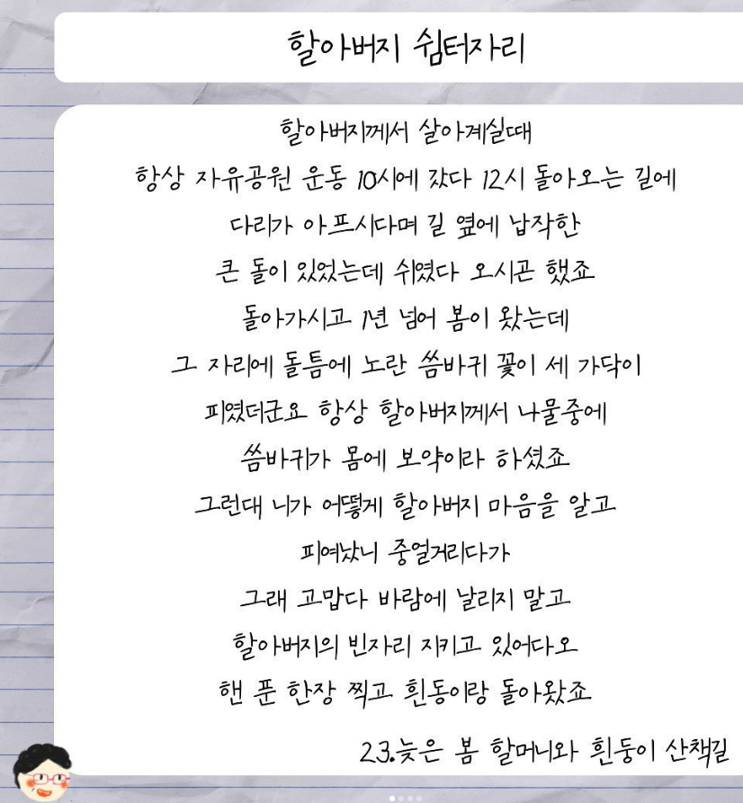 그러더니 어느 순간 글을 쓰기 시작했다. 그리운 누군가와 홀로 살아내어야 할 당신의 시간들을.... 서툰 붓글씨로 한지에 써 내려가기 시작하셨고, 그 글을 사랑스러운 조카가 "79세 할머니와 손녀의 종알종알 이야기"라는 이름으로 인스타에 올리기 시작했다.