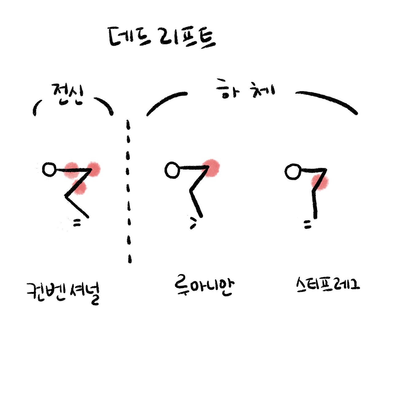 트쌤은 하루를 데드리프트 집중의 날로 정하고, 종류별로 매우 디테일하게 단계별로 챡챡챡 가르쳐줬다. 진짜 땀이 줄줄 흘렀다. 트레드밀에서 뛴 것도 아니고 그냥 기다란 철봉을 들었다 놨을 뿐인데, 겨우 올바른 자세를 익히기 위한 연습을 했을 뿐인데 땀이 뚝뚝 떨어지다니 와 이거 뭐야 재밌다 신난다. 다음에는 바벨 10kg 추가해달라고 해야지! 할 수 있다! 하고 싶다! 집에 와서 선생님이 그려준 그림을 아이패드에 옮겨 그리며 혼자 맨손으로 복습을 해봤다. 나 이제 웨이트트레이닝도 즐기고 싶은 사람이 된 거 같다. 앗싸. 운동을 취미로 쉬엄쉬엄 목숨 걸고 하는 사람이 어딨어요... 그 사람이 바로 나예요...