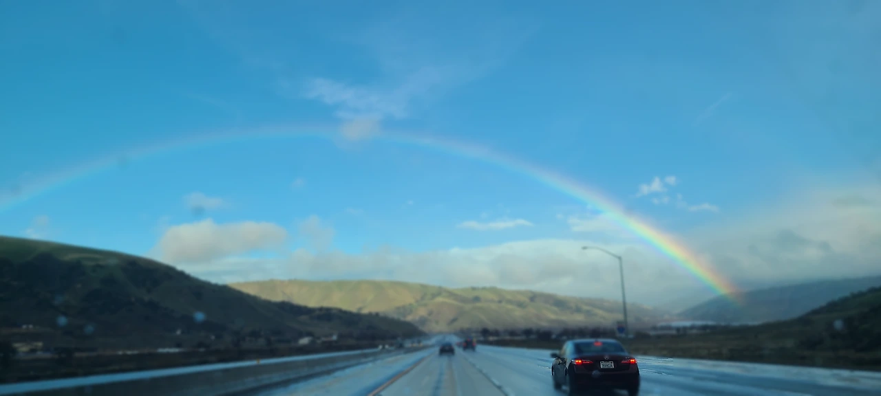 비가 내내 오락가락했던 캘리포니아를 통과하는 길에서는 산에서 시작해서 땅끝으로 떨어지는 큰 포물선을 그리는 무지개를 3번이나 보았다. 첫번째 무지개를 보는 마음은 첫만남의 설렘, 두번째 무지개를 보는 마음은 반가움, 세번째를 보는 마음은 권태스러움. 세번만에 훅떨어지는 흥분은 연륜에서 우러나는 기술이다.