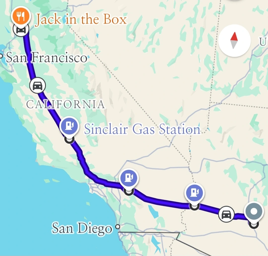 지도 상단에 보이는 햄버거집 'Jack in the Box'에서 저녁을 대충 떼우고, 첫날밤 목적지로 정했던 Sacramento, CA에서 하룻밤을 묵는다.