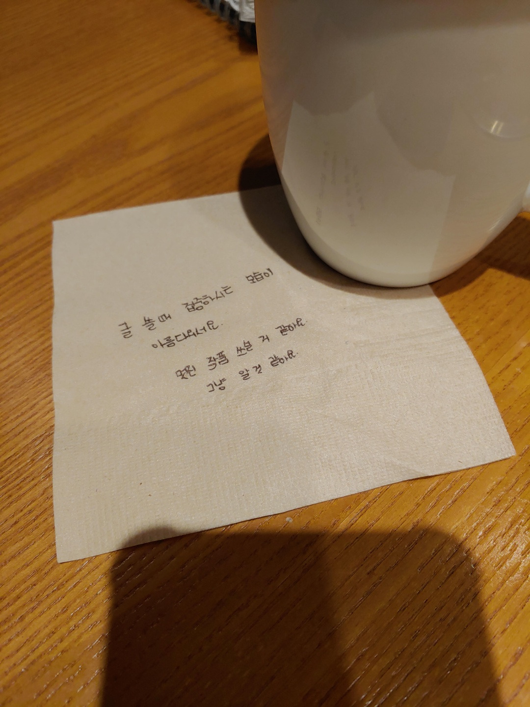 대놓고 말하면 마시고 싶어 마시는 건 아닙니다. 그저 남편 기다리는 시간이 적적해 한 잔 홀짝이는 것 뿐입니다. 홀로 집에 있기 싫다는 마음이 커피숍으로 나를 내몬 셈이고 덕분에 밤에도 글 작업을 하는 겁니다. 그래도 어두운 밤, 쓴 커피, 글쓰기는 제법 분위기가 납니다. 그런대로 버틸만한 시간이 됩니다. 외로웠던 것도 잊고 글에 몰입도 합니다. 아무도 모르게 집중하고 있으면 메시지가 옵니다.
