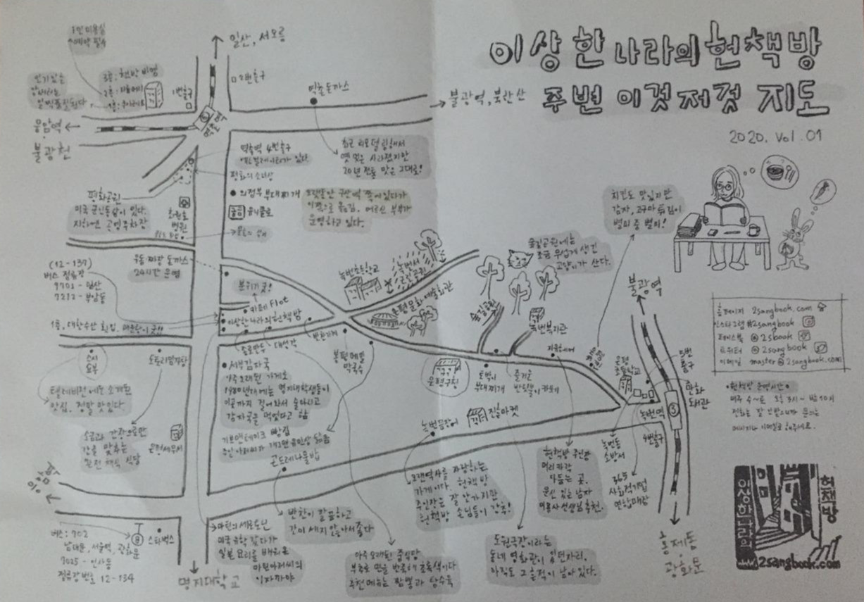 골목 깊숙이 숨어있는 것도 아닌데 여간해서는 사람들 눈에 띄지 않는 그런 곳 말이다. 영화 <해리포터>를 보았다면 해리와 친구들이 호그와트행 열차를 타던 9와 3/4승강장을 떠올려 보면 될 것 같다. 수많은 사람들이 무심히 지나다니는 승강장 한 쪽의 마법사만을 위한 출입구. 현실에도 그런 곳이 있다고 하면 거짓말이라고 할까. 하지만 ‘이상한 나라의 헌책방’을 달리 설명하기란 쉽지 않다. 큰길가에 있는 그 이상한 나라를 모르고 지나치는 사람이 많은데다 일부러 찾아갔다가 헤매는 경우도 왕왕 있기 때문이다. 찾기 힘들지만 그래도 ‘이상한 나라의 헌책방’을 방문하고 싶다면 몇 가지 기억해야할 말이 있다.