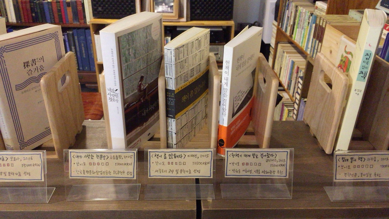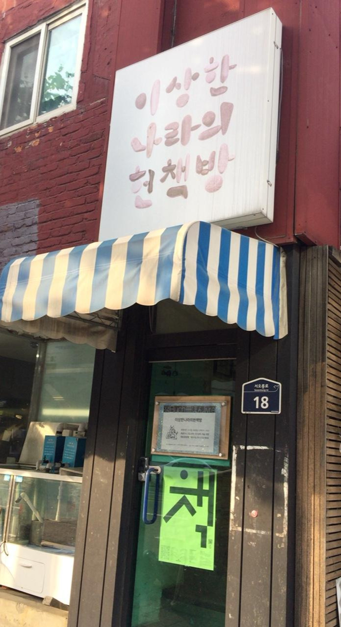 어느 날 우연히 토끼굴에 빠진 앨리스가 모험을 시작하며 한 말이다. 우리에게 책 읽기란 어느새 모험 같은 것이 되었다. 회중시계를 들여다보며 바삐 걸어가는 토끼씨처럼 시간에 쫓겨 걷는다면 ‘이상한 나라의 헌책방’으로 들어가는 출입구는 영영 찾을 수 없을지도 모른다. 평범한 상가가 늘어선 거리의 건물 귀퉁이, 한 사람이 들어갈 수 있을 만한 좁은 유리문과 같은 폭의 차양, 간판은 책으로의 모험을 떠날 준비가 된 사람 눈에만 띄도록 만들어졌기 때문이다. 특히 파란색 줄무늬 차양 위 흐릿한 글씨의 간판은 직접 보고도 책방이 맞나, 들어가도 되나? 싶은 생각에 문을 열기까지 약간의 용기가 필요하다. 그러나 출입구의 손잡이를 잡았다면 망설이지 말고 활짝 열어보시길. 참! 문이 열리는 시간은 수요일에서 토요일 오후 3시에서 10시까지이나 닫는 시간은 주인장 재량이니 잠겨있다고 실망하지 말고 꼭 다시 도전해 볼 것을 권한다. 모든 모험에는 첫걸음이 필요하므로.