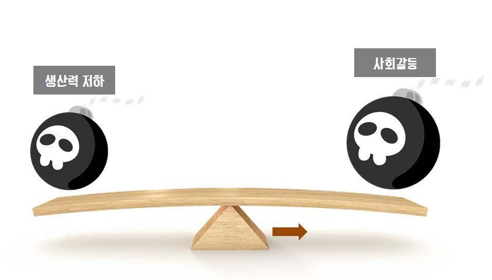 결국 살펴보니 500년 전의 싸움도 지금과 별반 다를 바가 없다. 그 시절의 지식인들조차 2019년과 똑같이 ‘생산력 (혹은 의욕)’과 ‘빈부격차’ 사이에서 줄다리기를 했다. 이 현상을 한번 그림으로 표현해보면 지렛대(사회)에 ‘생산력 저하’와 ‘사회 갈등 격화’라는 폭탄이 양끝에 올라가 있는 시소를 그릴 수 있을 것 같다. 어느 쪽이든 시한폭탄이 땅바닥에 떨어지는 순간 시소는 산산조각이 나고 만다. 올바른 사회 정책이란 폭탄 사이에 균형을 잘 유지하며 평형을 이루는 기술이라고 하겠다.