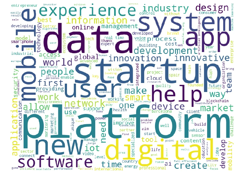 다음은 업체들이 스스로를 어떻게 소개하고 있는지 분석해보았다. 개별 업체들의 소개 페이지를 들어가 보면 모두가 5-10 문장에 걸쳐 ‘우리는 어떤 업체구요, 뭘 하고 있구요, 꿈은 뭐예요’라는 식의 소박하면서 동시에 웅장한 자기소개를 적어 놓고 있다. 이런 업체들이 자기소개에서 ‘자주 쓰는 단어’를 꼼꼼히 분석해보면 ‘올해 출전한 업체는 대략 이렇습니다’를 뽑는 것이 가능하지 않을까. 아주 간단한 자연어 처리 과정(Stemming Lematizing 등)을 거쳐 이들이 쓰는 단어들을 ‘구름 형태’로 만들면 대략 이런 그림이 나온다.