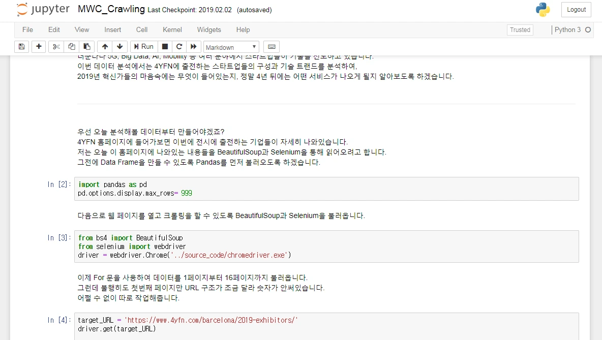 먼저 전시회 홈페이지에 들어가 '출전 업체가 몇 개인고' 살펴보니 2019년 2월 10일 기준으로 702개의 업체가 등록되어 있다. 이걸 일일이 클릭해서 확인하려면 마우스도 나도 녹초가 될 것이 불 보듯 뻔한 일인지라 간단한 Python 웹 크롤러를 작성해 데이터를 전부 모아보기로 한다. 한 시간 정도 코드를 뚝딱뚝딱 만들어 출전 업체 리스트를 읽어 내니 702개의 회사가 빼곡히 들어찬 엑셀 시트 하나가 탄생했다. CPU의 중노동이 깃든 이 소중한 엑셀 파일에는 ‘출전 업체 이름, 행사장 위치, 업종, 상세 설명, 이메일, 전화번호’ 등이 담겨있다. (혹시 필요하신 분은 댓글에 남겨주시길)