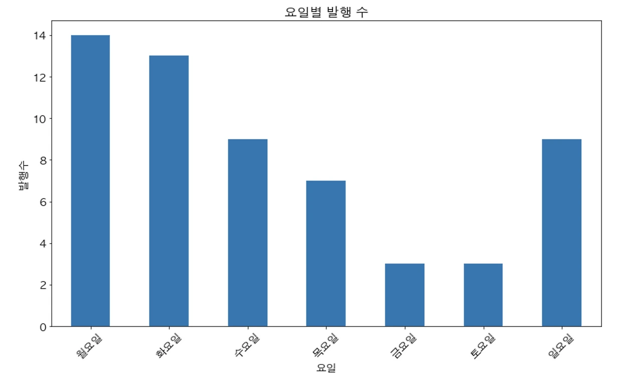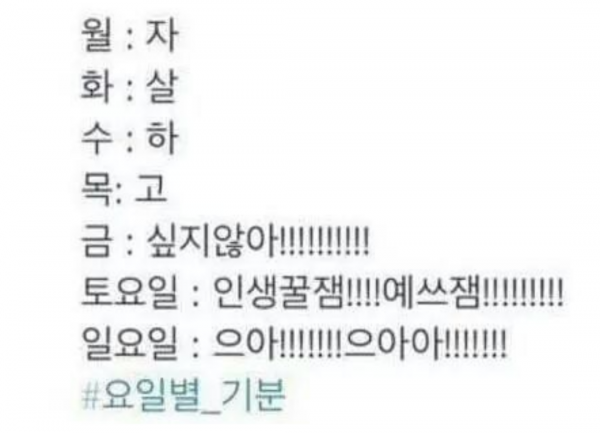 이 그래프는 내가 지난 일 년 간 무슨 요일에 글을 올렸는지 보여주는 자료다. 그런데 재미있는 점은 나의 '주간 불행지수'와 업로드 수가 ‘완전히’ 정비례한다는 것이다. 회사 다니는 분들은 쉽게 공감하시겠지만, 일단 직장인은 일요일 저녁이 되면 기분이 안 좋아진다. 월요일, 화요일은 회사에서 가장 큰 스트레스를 받으며 수요일이 되면서 서서히 마음의 평화를 찾는다. 금요일, 토요일에는 뭘 해도 행복하다.