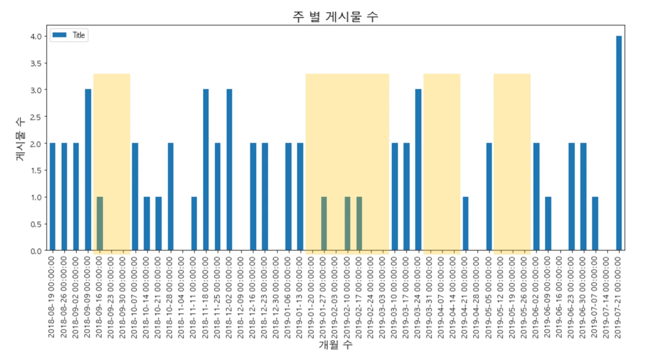 이것은 마치 피트니스 센터에서 1년권을 결제하고 첫 주는 아침저녁, 보디빌더처럼 운동하다가, 다음 주부터 기력이 쇠하는 다이어터의 패턴 같다. 특히 그래프에 노란색으로 표시한 영역은 이런 '번아웃형 글쓰기 패턴'을 제대로 증명하고 있다. 그야말로 황량하다. 이제는 한주에 한편을 쓰더라도 꾸준히 쓰는 습관을 익혀야겠다. (고 다짐해 본다.)