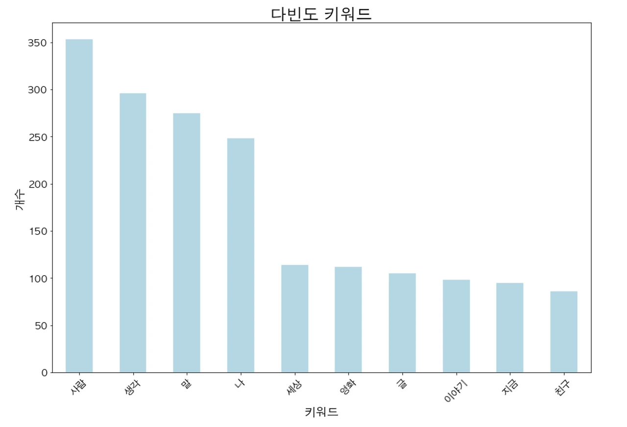 마지막으로 내가 그동안 무슨 글을 써왔는지 살펴보았다. 1년 동안 단어를 무려 3만 개나 써왔으니 그 단어를 분석하면 분명 평상시 ‘김광섭’의 머릿속을 들여다볼 수 있을 거라 생각했다. 그렇게 내 글에 자주 등장하는 키워드 탑 10을 뽑아보았다. 그 결과가 아래의 그래프와 같다. [사람-353회, 생각-296회, 말-275회, 나-248회, 세상-114회, 영화-112회, 글-105회, 이야기-98회, 지금-95회, 친구-86회]