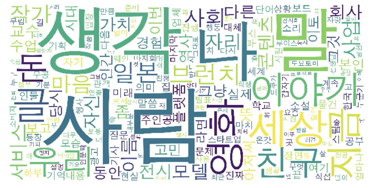 그러니까 이걸 한 문장으로 묶어보면, ‘[나]는 [사람]와 [세상]에 대한 [생각]을 [지금]까지 [말]과 [글]로 [이야기]했고, 그 주제는 [영화]나 [친구]에 관한 글을 많이 썼다’는 것이 된다. 불용어(의미 없는 단어, 예: 것, 하나, 정말 등)를 처리하는 것 외에 키워드 조작은 딱히 하지 않았는데, 결과가 이렇게 나오니 무척 신기하다. 이처럼 사람 냄새나는 키워드로 글을 썼다는 게 어쩐지 뿌듯하다. 하지만 동시에 특정 ‘전문 분야’ 글은 거의 없다는 게 심심한 점이다. 다시 한번 이 결과를 워드 클라우드를 표현해 보면 아래와 같은 그림을 그릴 수 있다.