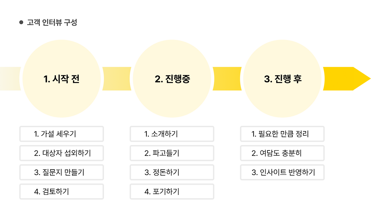 그래서 실전적인 인터뷰 요령이 필요합니다. UX교과서에 나오는 선언문, 정제된 그래픽보다 ‘진짜 날것 그대로 오늘 당장 써먹을 요령’이 필요할 수 있습니다. PM 실무자로 일하며 배운 점을 인터뷰의 1) 시작 전, 2) 진행 중, 3) 마친 후 3단계에 걸쳐 정리해보았습니다.