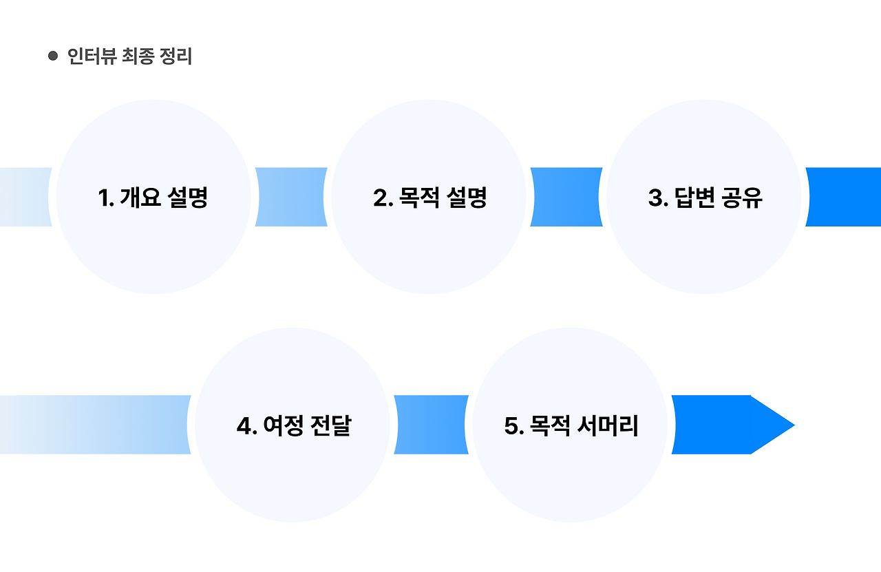 목적은 적게는 2번, 많으면 3번까지도 말해도 됩니다. 이런 과정이 있어야 공유를 듣는 사람들이 '아 오늘 저거만 알면되는구나'하고 인터뷰 내용을 꼼꼼하게 듣습니다.