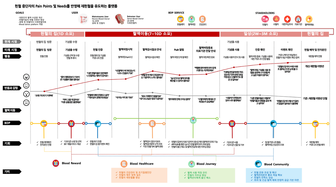 수집한 정보를 메타(meta)화 합니다. 인터뷰 참가자들의 답변을 종합하여 '일반화'된 그림을 그립니다. 이때 시간이 허락한다면 유저 저니 맵(Journey Map) 같은 시각적인 도구를 쓰는 것도 좋습니다. 사람은 글보다 그림을 잘 기억합니다. 우리가 얻어낸 정보를 글에서 그림으로 바꾸고 공유받는 사람들이 '한 개의 형상'으로 간직할 수 있도록 도와줍니다.