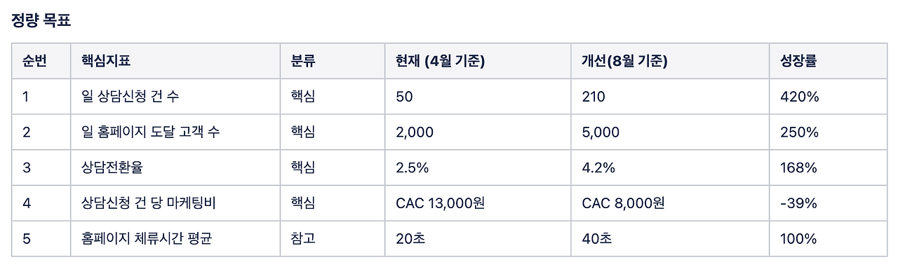 정량적 목표는 선언적 목표를 달성했을 때 변화할 지표입니다. 등산로 초입에서 정상을 손으로 가리키며 ‘저-어기까지 올라갈 겁니다’ 말하는 것과 비슷합니다. 아래 표처럼 나열하는 방식도 가능하고, 북극성 지표를 달성하는 산식으로 써도 좋습니다. 정량목표는 PM의 예상보다 살짝 높게 잡습니다.