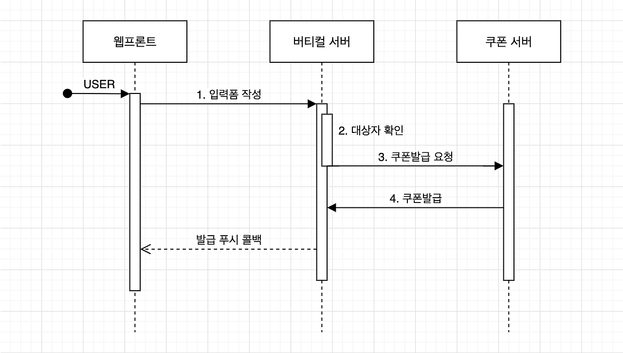 예를 들어 간식 구독 상담 신청 시 첫 이용 50% 할인 쿠폰을 지급하는 기능을 넣는다면 시퀀스 다이어그램으로 쿠폰 발급 프로세스를 정리해 둘 수 있습니다. 이런 과정 역시 글로 써도 되는 일이지만, 그림 하나로 글을 크게 단축할 수 있고 개발자의 관점에서 이해하기 쉽기 때문에 삽입합니다.