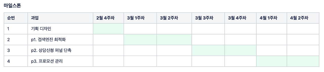 첫째, 대강 적습니다. 말이 좀 이상한데요. 그 이유는 어차피 일정을 WBS(Work Breakdown Structure)에서 다시 논의하기 때문입니다. (PM일을 하면 아시겠지만 일정이 계획대로 흘러가는 적은 거의 없습니다.) 상세기획서의 마일스톤이란 말 그대로 표지석입니다. “대략 언제까지 어느 정도 하겠다”만 가늠할 수 있다면 충분합니다.