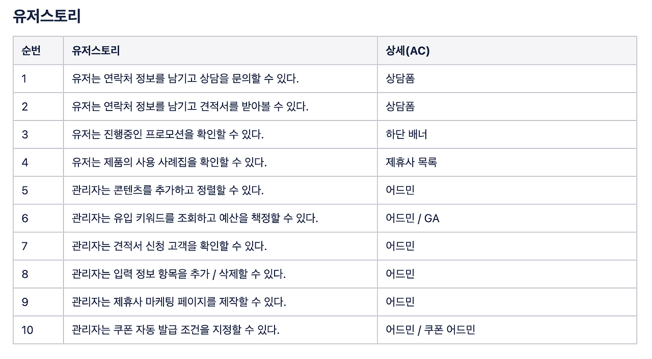 이제 위 방향성을 바탕으로 유저스토리를 씁니다. 제품에 필요한 기능을 컴퓨터의 언어로 바꾸기 전 문장 단위로 정제하는 작업입니다. 유저스토리에 대해서는 다음 챕터에서 따로 자세히 다루겠습니다. 유저스토리만 잘 써도 방향성 정돈이 깔끔하게 완료됩니다.