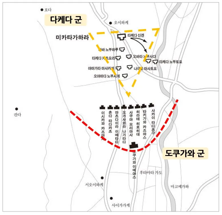이때 도쿠가와는 도토미에 있는 본인의 성에서 '버티기'를 준비하고 있었습니다. 식량과 무기를 잔뜩 쌓아놓고 '적군이 오기만 해봐라' 잔뜩 벼르고 있던 상태였죠. 그런데 다케다 군은 이런 전략을 비웃기라도 하듯 도쿠가와를 지나쳐 곧장 서쪽으로 진군을 계속합니다. 유유히 멀어져 가는 다케다를 성안에서 지켜보던 도쿠가와는 바로 성문을 열고 뛰쳐나와 오다군과 함께 추격을 시작합니다. 다케다 신겐의 지략과 용맹함을 익히 들어 알고 있던 주요 가신들은 '주군 지금은 성문을 걸어 잠그고 농성을 하셔야만 합니다'라며 도쿠가와를 부득부득 설득하지요. 하지만 도쿠가와는 이때 가신들의 말을 듣지 않고 본인의 독단대로 판단합니다.