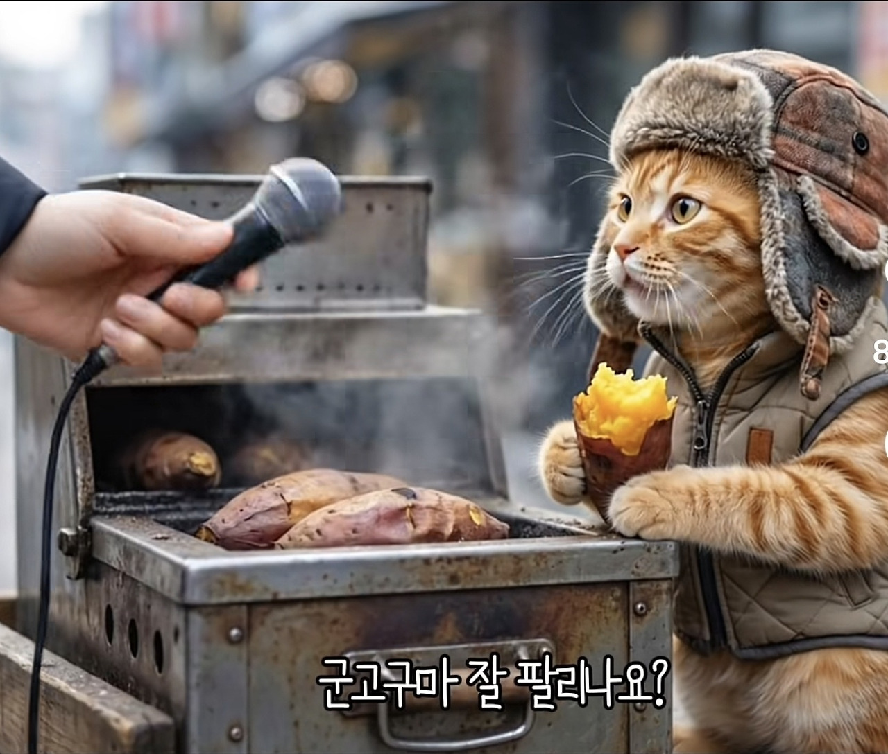 군고구마를 들고 인터뷰를 받는 고양이까지...
