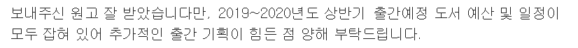 이윽고 기다림이 시작되었다. 혹여나 답장이 왔을까 하루에도 수십 번씩 이메일을 들여다보았다. 그 과정에서 나는 반기획출판이라는 제안도 상당히 많이 받았다. 처음에는 거절이 아닌, 어떤 제안을 받은 게 마냥 기쁘기만 했는데 자세히 들여다보니 일정 부분 내가 돈을 내야 한단다. 그렇게 내 투고에 대한 대답은 거절과 반기획출판 제의만 번갈아가며 올뿐이었다. 답장이 없는 곳은 말할 것도 없다.