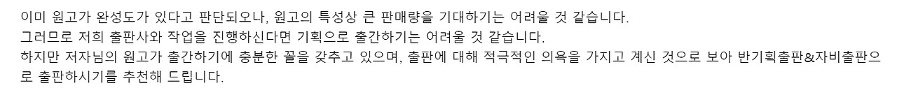 그 와중에 몇 군데에서는 글에 본인의 이야기가 거의 들어가 있지 않다는 것이 아쉽다며 혹시나 에세이 위주로 글을 수정한 후 다시 투고해줄 수 있겠냐고 물어보았다. 그런 이야기를 몇 번 들으니 이게 문제였구나 싶었다.