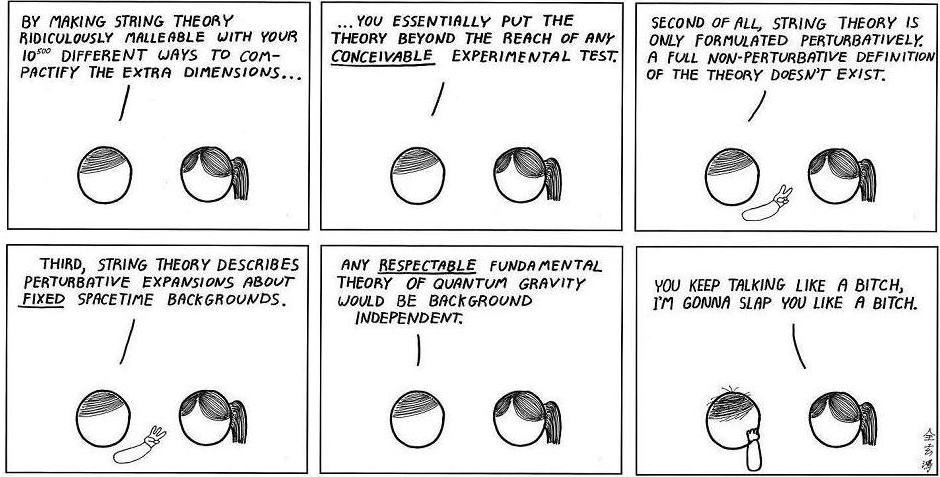 현재 수준에서의 끈이론 혹은 초끈이론이라는 것이 사실은 생각보다는 간단한 것인데, 주로 주어진 시공간 위에서 (초)끈이 어떻게 움직이느냐 하는 문제를 던져 놓고, 이를 양자 역학의 입장에서 풀어내는 것으로 시작한다. 한편 (초)끈의 양자 역학과 소립자의 양자 역학은 비슷해 보이면서 한 가지 점에서 근본적으로 다른데, (초)끈의 경우 자신 주변의 시공간에 대하여 대단히 잔소리가 많다는 점이다. 시공간의 모습이 조금이라도 마음에 들지 않으면, "나는 모순 덩어리입니다" 말하고 죽어버린다고나 할까?