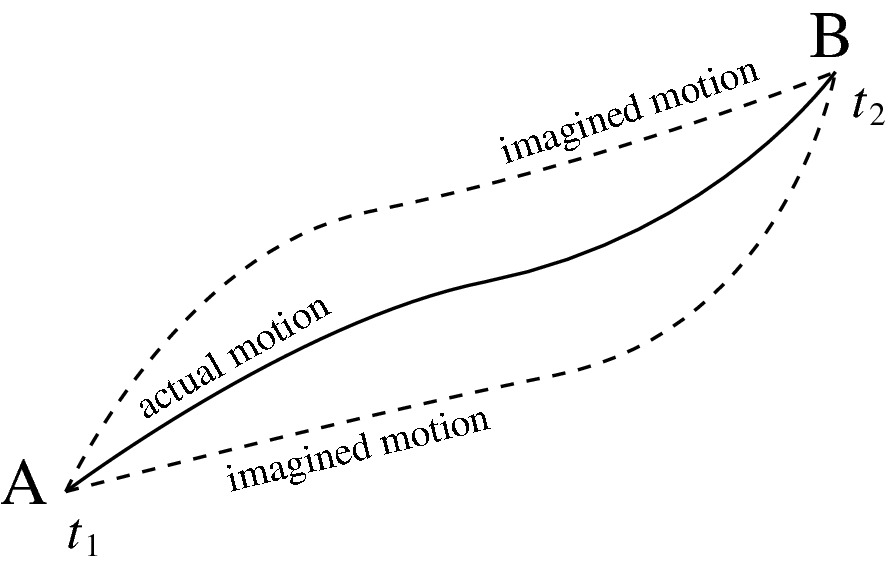 “시작 지점 A에서 시작하여 종료 지점 B까지 어떤 궤적이 뉴턴 역학에 의하여 구현되느냐”라고 조금 다른 질문을 하면 뉴턴 방정식이 정하는 궤적이 항상 "작용" 혹은 Action이라고 부르는, 궤적 전체를 알아야 계산할 수 있는 물리량을 최대화 혹은 최소화한다는, 조금 더 일반적으로 극한화 한다는, 원리이다. 여기서 “극한”이라는 말은 이 실제 궤적으로 계산한 Action과 주변의 살짝 다른, 실제로는 구현되지 않는 궤적의 Action을 비교했을 때 그 값이 거의 변하지 않아야 한다는 의미이다.