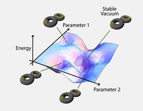 움푹 패인 곳마다 섬우주가 하나씩 있고, 그 각각은 서로 다른 6차원 공간과 서로 다른 우주 상수를 가지고 있다. (출처: www.learner.org)