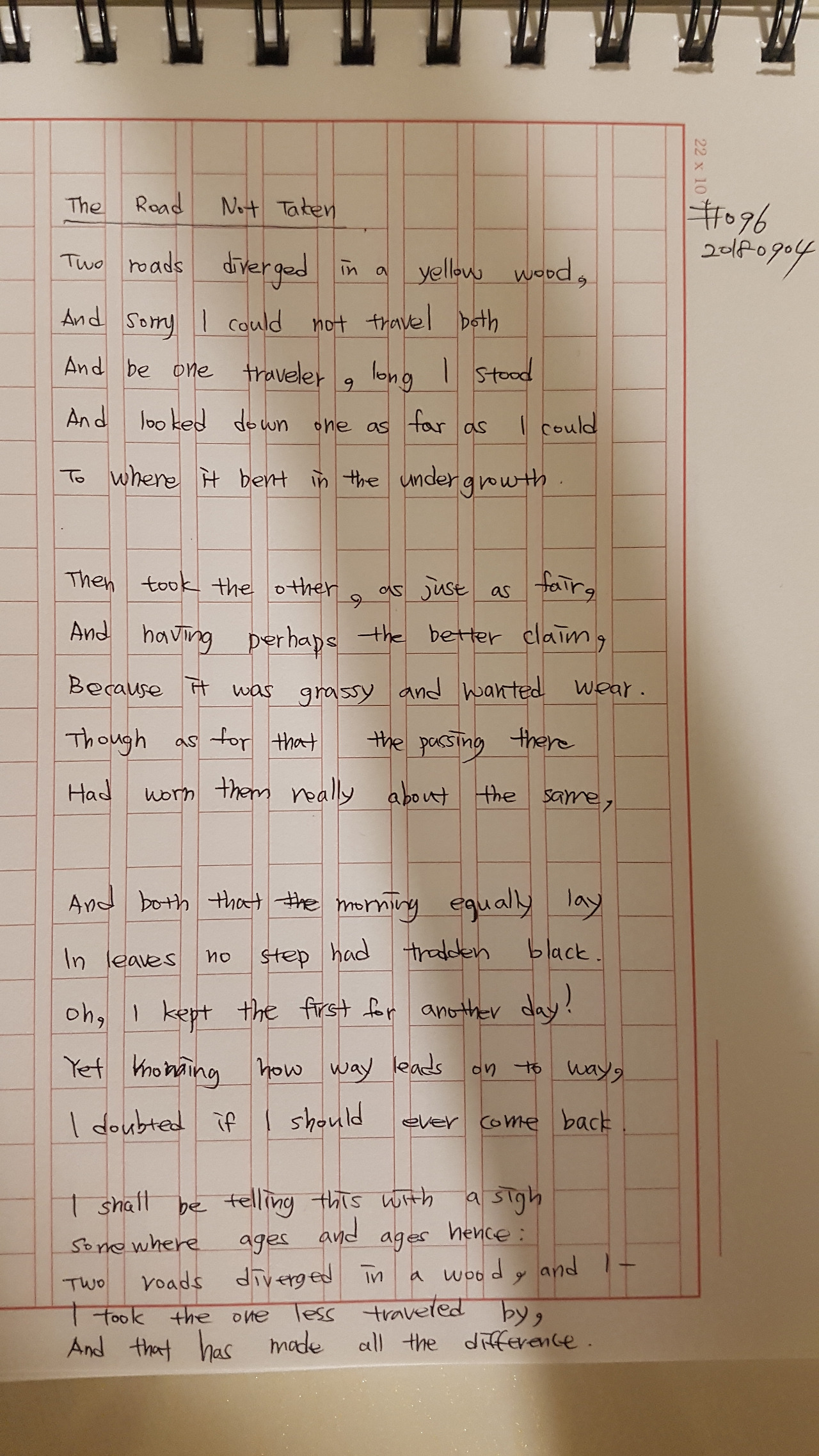 나는 두 길을 다 가지 못하는 것을 안타깝게 생각하면서,