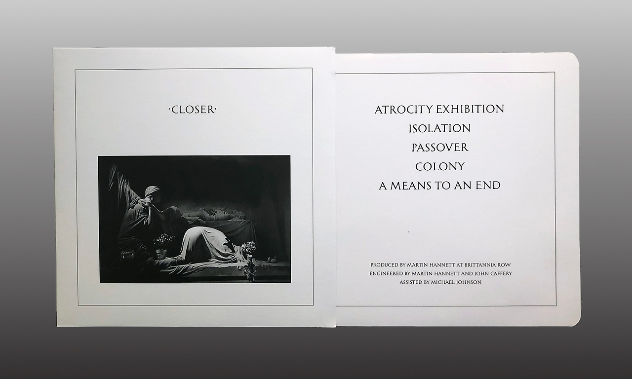 앨범 커버는 전작의 디자인을 맡았던 피터 새빌(Peter Saville)이 마틴 앳킨스(Martyn Atkins)와 함께 작업했다. 그래픽 디자인을 위해 오리지널 이미지를 직접 만들지 않고 기존의 이미지를 거의 그대로 가져다 사용하는 새빌의 포스트모던한 방식은 이번에도 계속되었다. 판화용 카드처럼 부드러운 질감을 드러내는 종이에 인쇄된 <Closer>의 디자인은 미묘한데, 정사각형 공간을 캔버스처럼 사용해 단일 이미지로 가득 채우는 일반적인 앨범 커버 디자인과 달리, 흰색으로 비워둔 바탕에, 사방 여백을 두고, 가는 선의 프레임을 두르고, 제목과 사진을 중앙 정렬로 배치한 구성이어서 단일 이미지가 아니라 레이아웃 작업이 된 지면으로 인식된다. 또한 고전적 서체로 세팅된 텍스트와 종교적 이미지를 담은 흑백 사진이 고딕스러운 분위기를 풍기면서 얼핏 중세 책의 지면을 떠올리게 하기도 하지만, 흥미롭게도 이 지면의 핵심 요소로 자리한 사진은 오래된 이미지가 아니라 당시 새빌이 트렌디한 잡지에서 발견한 버나드 피에르 울프(Bernard Pierre Wolff)의 동시대적인 사진 작품(1978년 작)이다.