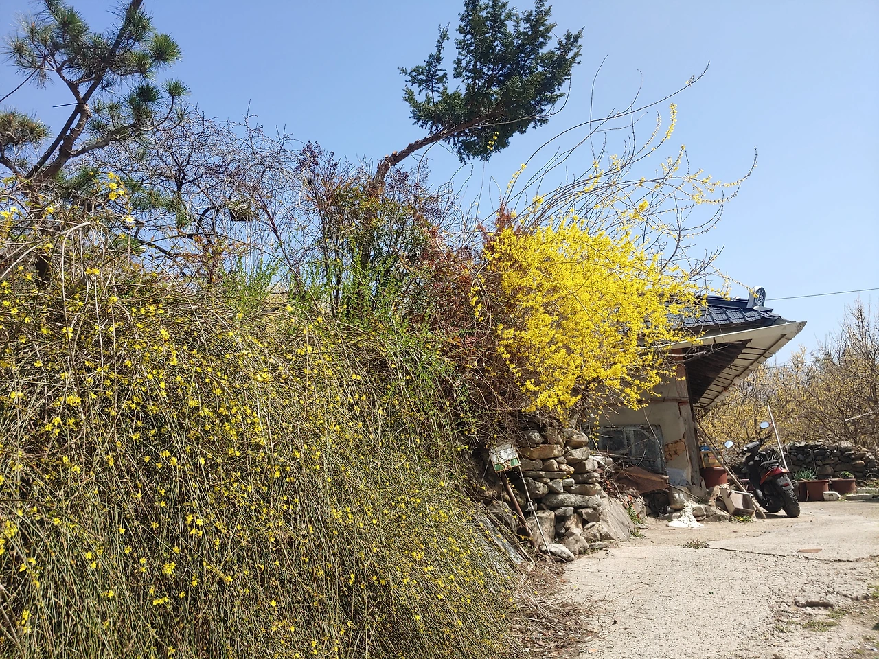 영춘화는 봄이 본격 시작하는 3월 후반이나 4월초에야 만개하는 개나리보다 이른 3월 초중순에 핀다. 그래서 봄맞이꽃, 영춘화(迎春花)로 불리며 매화 피는 시기와 겹치는 까닭으로 ‘노란 매화’라는 뜻의 ‘황매(黃梅)’라고도 불린다. (사실 황매화는 따로 있다. 황매와 겹황매, 즉 죽단화도 서로 다른 꽃인데 음, 너무 멀리 가지 말자. 지금은 개나리영춘화 타임!)