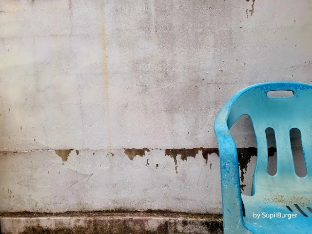 뒤뜰 파란색 낡은 플라스틱 의자에 앉았다.