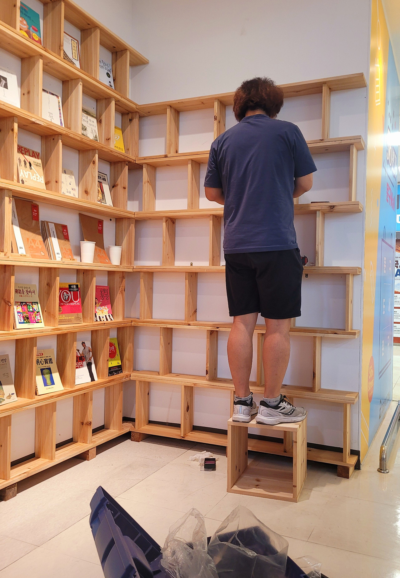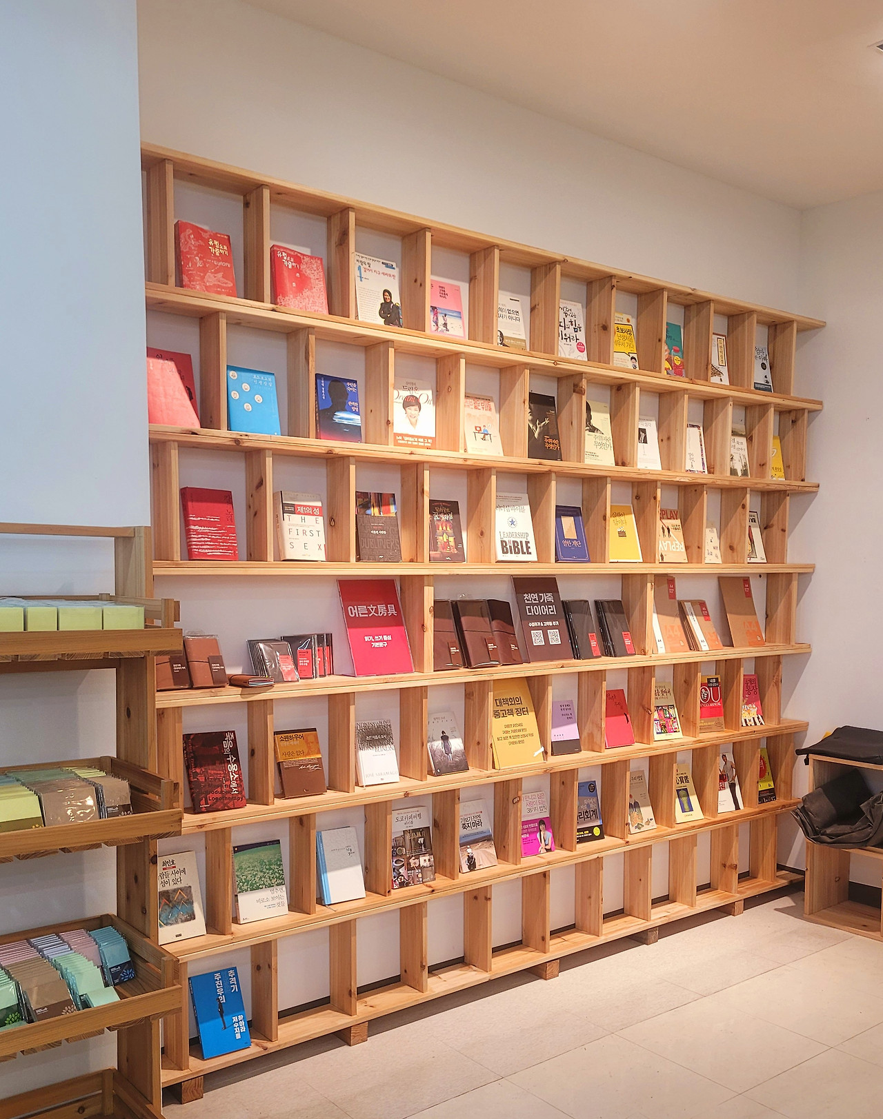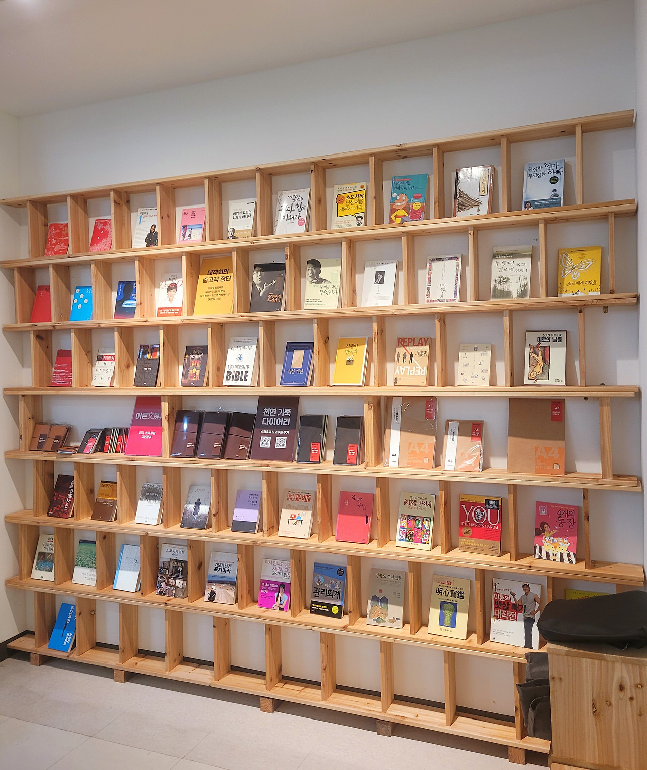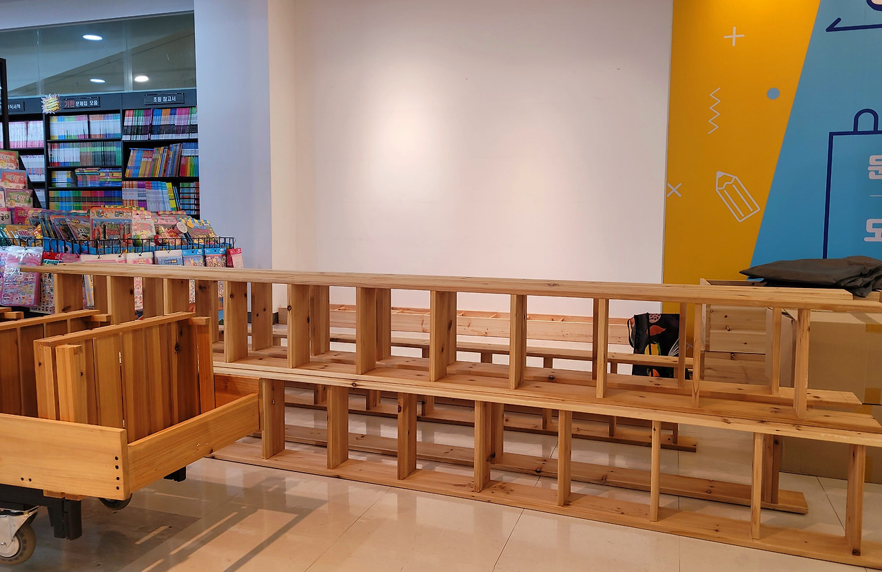 가지고 온 (대책 회원들의) 중고책을 꽂았다. 가죽 다이어리와 노트, 메모지도 사이사이에 배치했다. 동촌커피는 짙은 회색 벽과 조화를 생각해서 어두운 톤의 원목으로 서가를 만들었는데, 이곳은 조명도 밝고 벽도 흰색이라서 밝은 원목을 썼다. 파는 책이냐, 구경해도 되냐, 판매는 언제부터 하냐, 묻는 사람이 점점 늘어난다. 이거 되는 일인데, 속으로 웃었다. 다음 날, 2차까지 마무리했다. 이제 진열대 겸 책을 읽고 앉아 쉴 수 있는 테이블과 의자만 만들어 들이면 마무리된다.