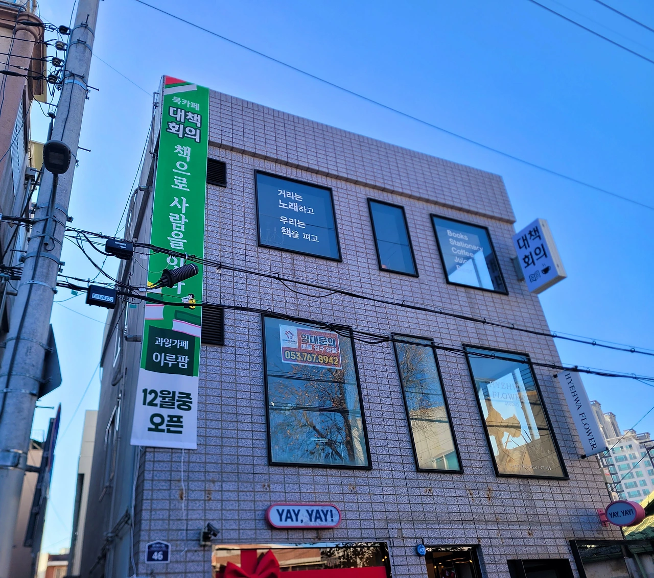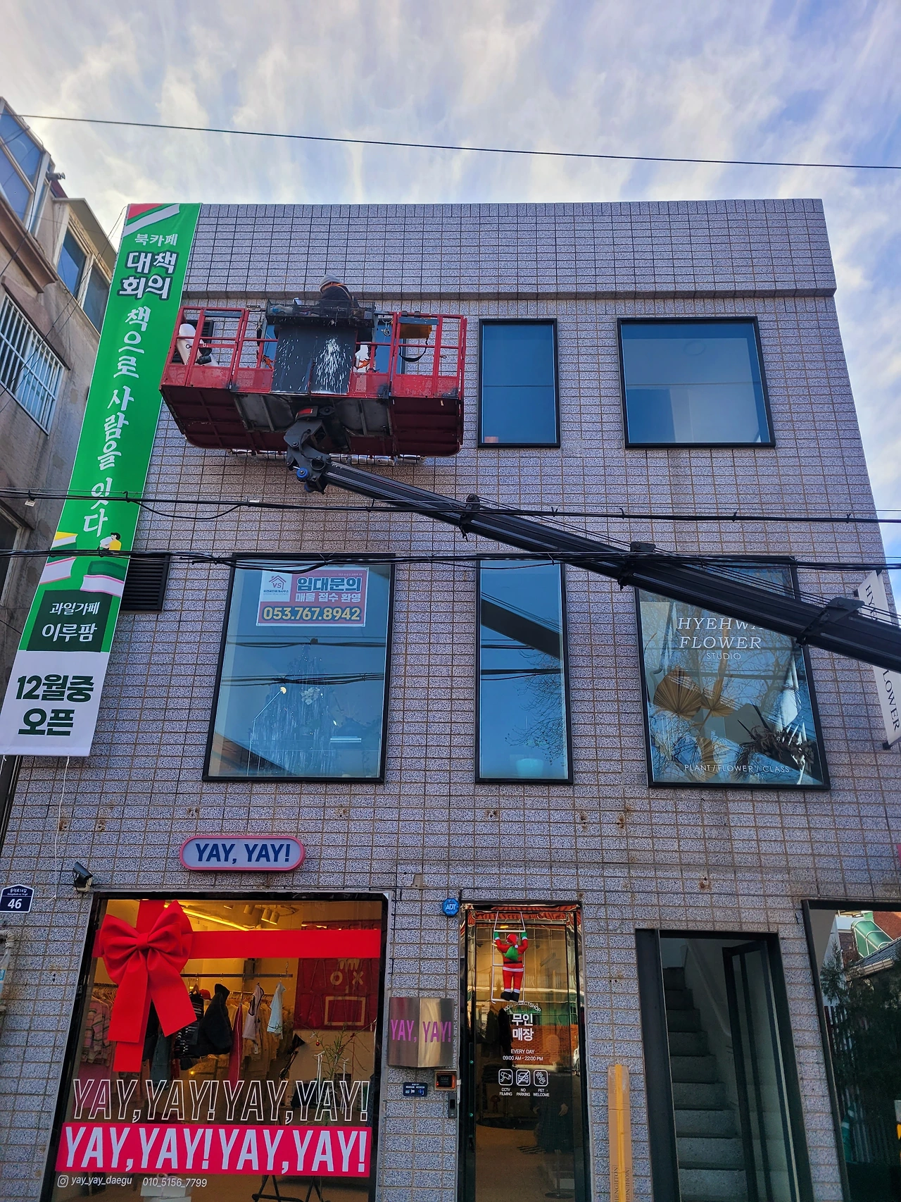 출입구 시트지는 여자 손님 키높이를 고려해서 친구가 잡고 있는 위치보다 조금 낮은 높이를 가리켰다. 3층 큰 창 두 개, 가게 출입구, 그리고 1층 주출입구까지 작업은 빠르게 끝났다. 20대에 일을 시작해서 얼추 삼십 년 업력이라더니 과연 손이 빠르다. 돌출 간판도 불과 이삼십 분만에 제까닥 달았다. 시트지 쪼가리 줍고, 크레인에 간판 실을 때 거든 것 말고 내가 한 건 없다. 괜히 팔짱 끼고 멀리서 쳐다 보고, 작업하는 데 얼쩡 거린 게 다지만 그래도 오길 잘했다.