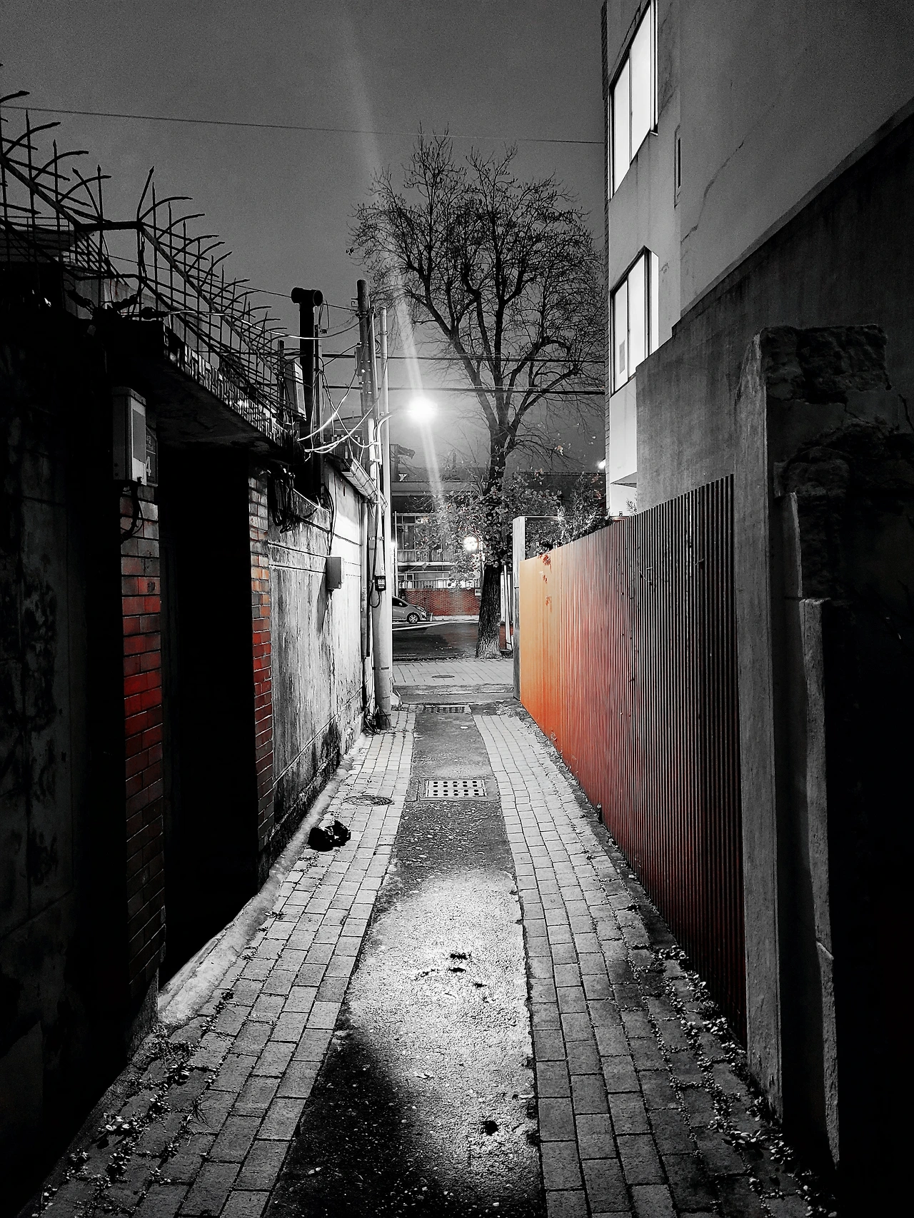 좁은 골목이 끝나는 저 앞에 이파리 몇 장 남지 않은