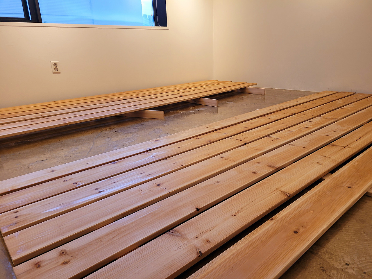 두 개의 벽에 좁고 긴 원목을 꺽쇠로 붙였다.