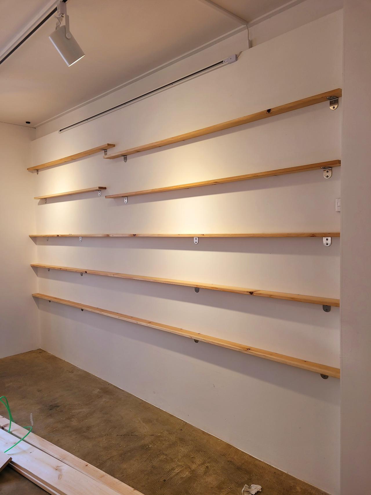 공간이 넓지 않은 곳은 좁은 책장을 벽에 고정하기로 했다.
