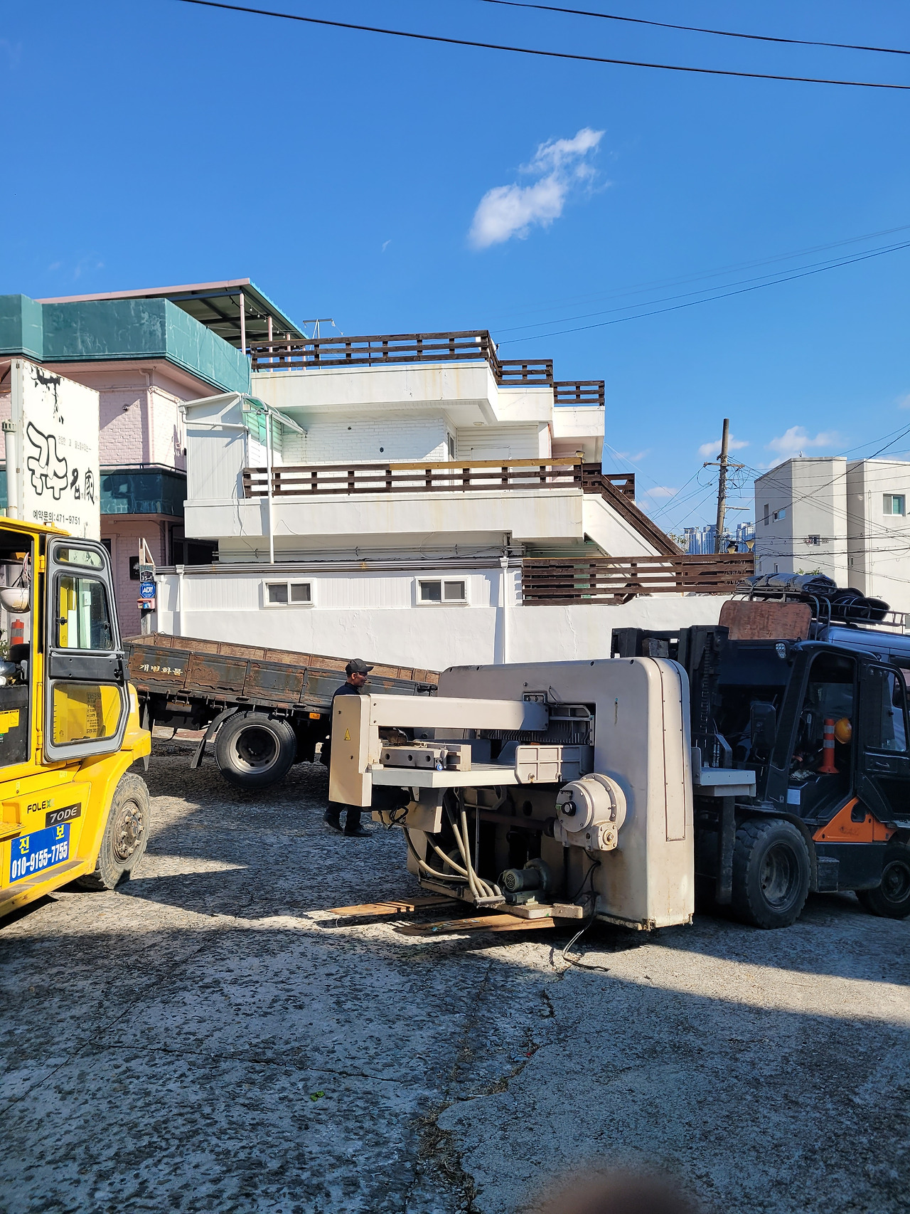 대형 지게차 비용은 그대로 지불하기로 하고 작은 지게차를 새로 불러서 공장문을 빠져나갈 수 있었다.