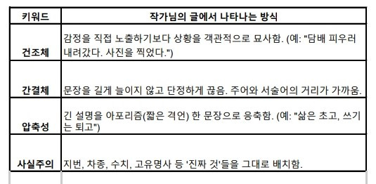 내 문체가 읽는 이들 눈에는 어떻게 보일까. 자기 얼굴은 잘 알지만 그래도 거울은 보는, 그 마음으로 제미나이와 챗GPT에게 내 글 분석을 시켰다. 위 표는 제미나이 분석이다. 내가 아는 내 얼굴이다. 남(?)들도 그렇게 보는구나, 싶다. ai는 대량의 문서 평균값을 찾는 기계니까.